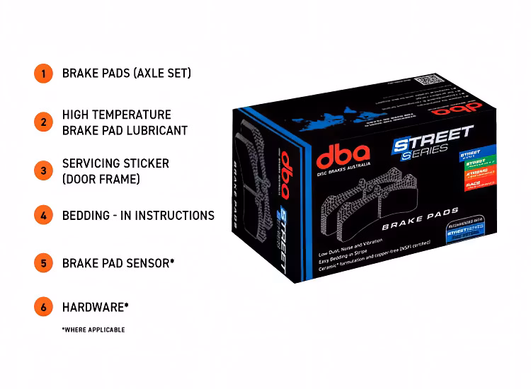 STREET SERIES bromsbelägg är det senaste tillskottet i DBAs omfattande sortiment av bromsprodukter. Dessa bromsbelägg är utvecklade för att möta och överträffa OE-standard (originalutrustning) och riktar sig mot ersättningsmarknaden. Serien har utvecklats med tre tekniska mål i fokus – att erbjuda en bromsprestanda på OE-nivå eller bättre, ha den bästa friktionsformuleringen för tillämpningen och komplettera DBAs marknadsledande STREET SERIES bromsskivor.
