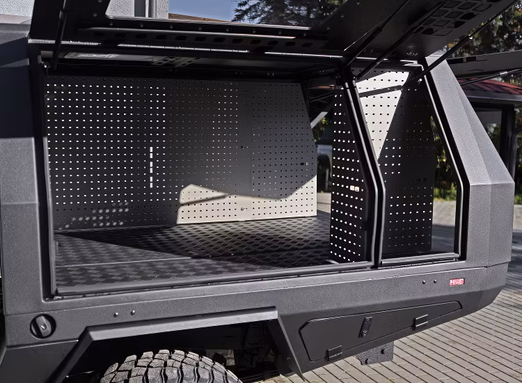 Övre delen är tillverkad i 3 mm aluminium och har fyra individuella, låsbara klaffar för enkel tillgång till olika utrymmen.