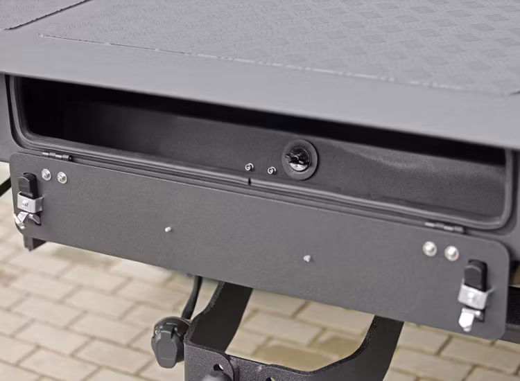 Utrustad med tre låsbara skåp för säker förvaring av verktyg och material.