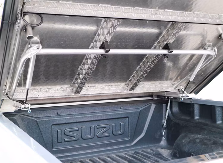 - Bilen kan köras med flaklocket i flera olika lägen: stängt, halvöppet eller helt uppfällt. Samtliga lägen fixeras i position genom antingen gasfjädrarna, midjelåset, låssprintar i gasfjädrarnas ben och T-spärren.