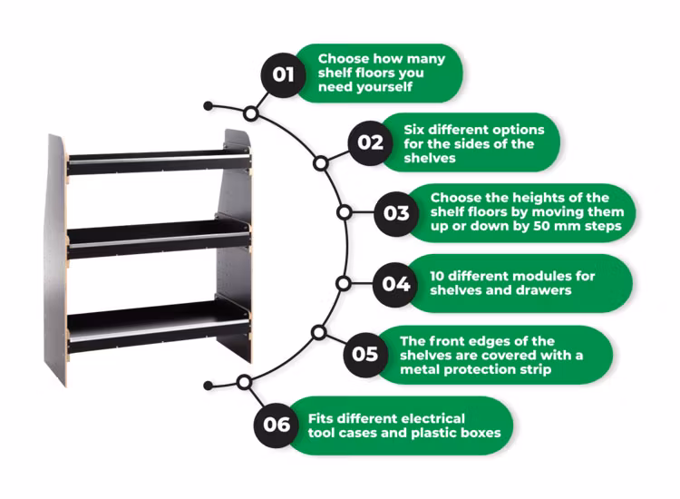 Tänk dig möjligheten att skräddarsy ditt hyllsystem baserat på storleken och formen på ditt lastutrymme. Med Vanerex Flex kan hyllorna enkelt sättas ihop genom att använda sidomoduler och hyllmoduler. Beroende på dina specifika behov kan du välja bland olika typer och antal hyllplan. Ett extra fördel är att deras höjd kan justeras i steg om 50 mm, vilket ger dig den friheten att skapa en perfekt passform för dina verktygslådor, lådor och behållare.