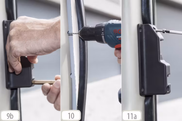 7. Om allt är OK, öppna skjutdörren, på B-stolpen, rita eller markera fästhål för låset (bild 9a; bild 9b), borra ett hål med ett 3,2 mm borr (bild 10) och fixera det kompletta låset med de medföljande självborrande skruvarna (smörj skruvarna). Fixera det (bild 11a; 11b).