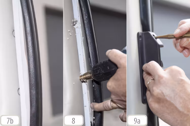 4. För låsbenen, markera området från plastkåpan på stolpen (bild 7a; 7b) och borra ett hål med ett 12 mm borr eller rita endast en halvcirkel (bild 8). Positionera låsdelen och fixera den, stäng sedan försiktigt skjutdörren.