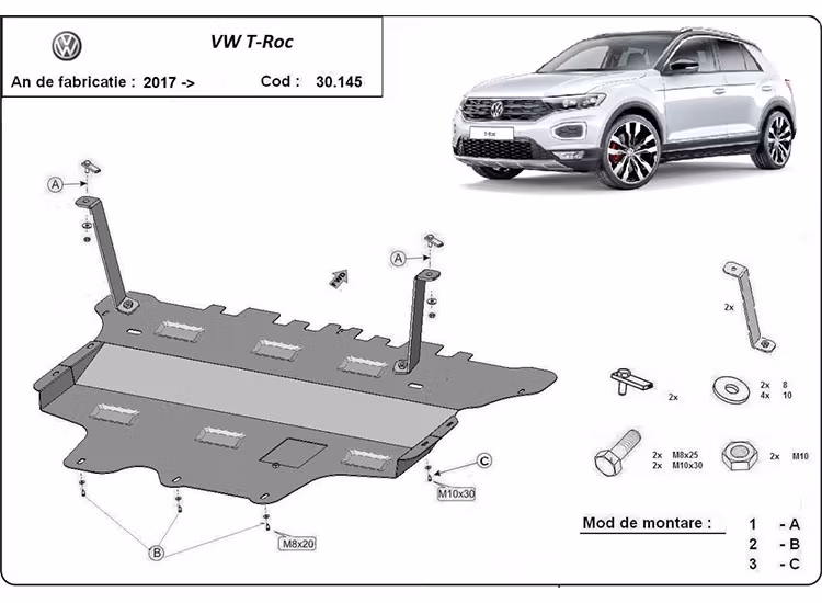 Underkörningsskydd till Volkswagen VW T-Roc 2017-2024. Monteras under motorn för att skydda motorn / växellåda & kylaren vid körning i terräng eller på sämre vägar där det finns en risk att man slår i något undertill. Monteras utan åverkan på fordonet. Monteringssats och monteringsanvisning medföljer.