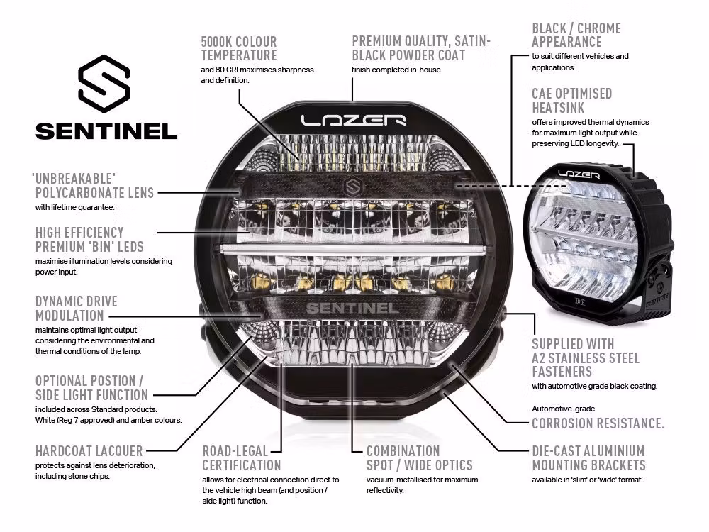 Lazer Sentinel-serien består av runda 9” extraljus i Standard- och Elite utförande. Lampan har ett svart pulverlackerat aluminiumlamphus och matchande monteringsfäste. Standardlampan är antingen svarttonad eller kromfärgad bakom den okrossbara polykarbonatlinsen och har 20 högeffektiva dioder.