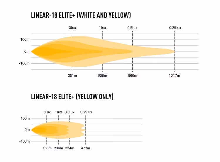 Linear 18 Elite + har en aerodynamisk design som är perfekt för att underlätta installationen där utrymmet kan vara begränsat. Elite + produkterna har även gula lysdioder som kan användas oberoende av varandra eller i kombination med det vita ljuset. Detta gör att föraren kan skräddarsy sin ljuseffekt efter sina önskemål, i synnerhet vid snö eller dimma där ett "mjukare" ljus (vid en reducerad färgtemperatur) eller gult ljus ofta anses vara mer önskvärt. Färgtemperatur vid vitt ljus är 5000K