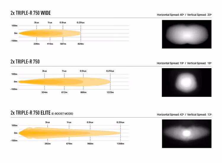 Lazer Triple-R 750 Elite med E-Boost (Generation 2) är utrustad med en "E-Boost”-teknologi vilket gör denna kvalitetsbelysning otroligt stark och lampan levererar ett kristallklart synfält med naturligt vitt ljus. Avlägsna en kåpa på lampan och en kontaktlös brytare lossnar så att belysningen blir väglaglig och E-godkänd. Även utan E-Boost påslagen lyser lampan imponerande bra! I E-godkänt läge är räckvidden vid 1 lux 231 meter och med E-boost aktiverat får man istället ljus som sträcker sig hela 517 meter vid 1 lux.