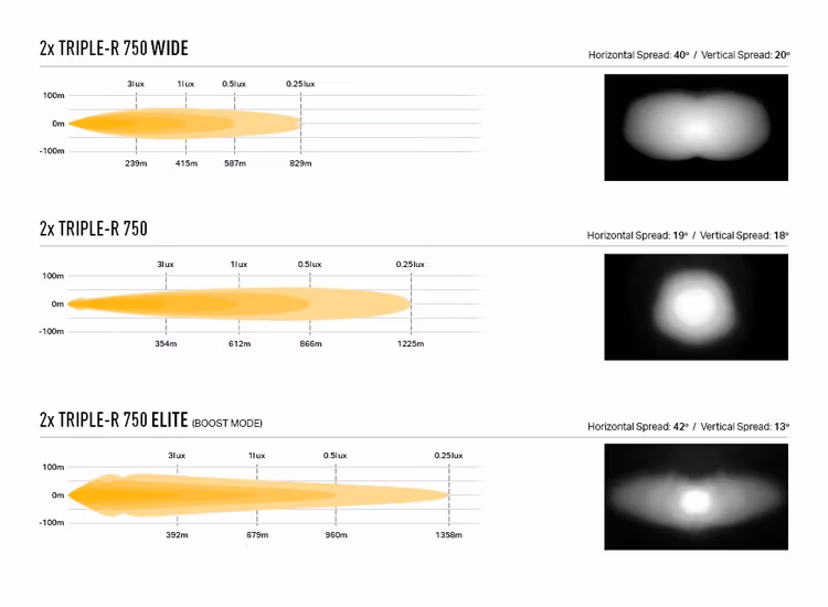 Triple-R 750 Gen2 har specialslipade reflektorer som är vakuummålade för bästa reflektion. Ljusbilden blir avlägsen, smal med jämn spridning (spot) vilket är perfekt för de längre vägarna.