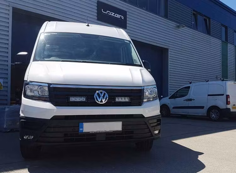 Komplett kit för montering i grillen på VW Crafter 2017+ inkluderat 2x Lazer Triple-R 750 Elite Gen2 lampor, relä/kabelsats samt monteringsfäste. Fri frakt!