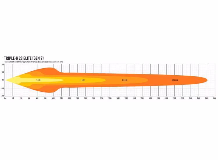 Den utvecklade ljusbilden ger en mycket lång räckvidd och säkerställer att du får god synlighet även på långa raksträckor. Den omformade linsen ger en god spridning av ljus ända ut i vägkanterna. Ljuskäglans spot är rund, likt de andra ramperna i Triple-R serien, vilket ger tillräcklig höjd även i backig terräng eller vid offroad-körning. Den behagliga färgtemperaturen på 5000K minskar påfrestningen på ögonen, vilket gör det bekvämt att använda rampen även under längre körningar.