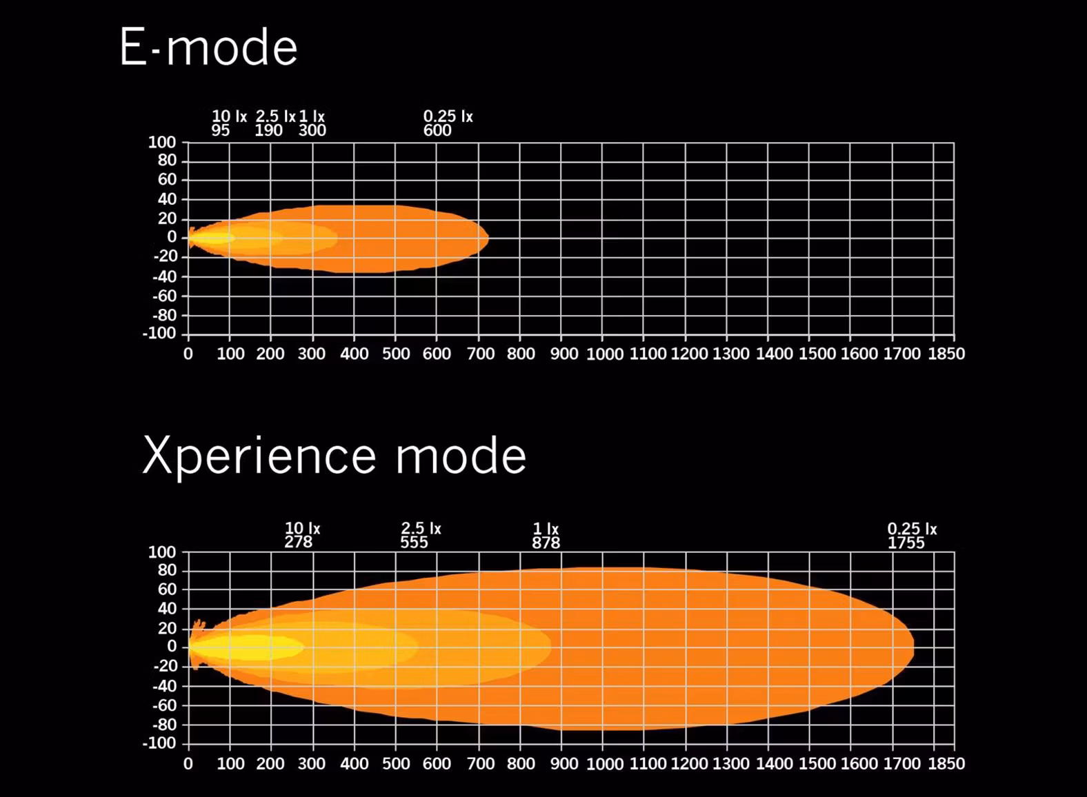 Den optimerade ljusbilden kombinerar god räckvidd med bred spridning, och färgtemperaturen är anpassad för att fungera även i dimma och snö. Rampen har ett dubbelt positionsljus med möjlighet att välja mellan gult och vitt ljus, samt en inbyggd Hello-funktion som aktiveras med två snabba blinkningar av helljuset.