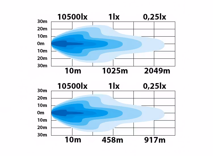 - Räckvidd: 458 m (E-läge) / 1 025 m (Powerboost, 1 lux)