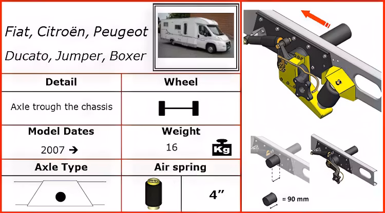MAD Luftfjädring som är modellanpassad för husbilar eller transportbilar med ett AL-KO chassi 90 mm = standard axel, ALKO Chassin med singel axel (Axle through chassis) 2007+.
