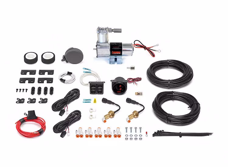 Hjälpluftfjädringskitet levereras med alla nödvändiga delar för en komplett lösning, inklusive luftkuddar med modellanpassade fästen, kompressorer, luftslang och manöverpanel. Detta gör det möjligt att förbättra din F-150s prestanda och körupplevelse avsevärt.
