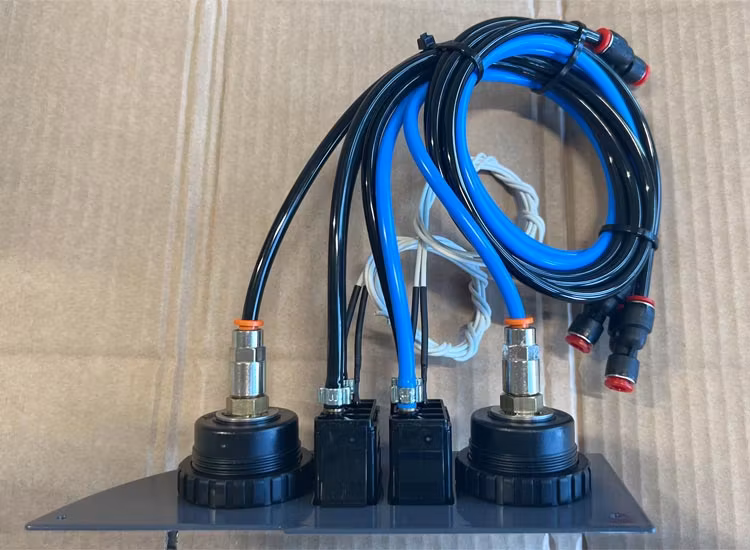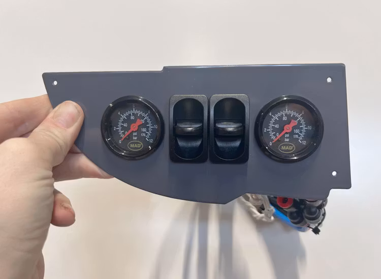 Denna sats innehåller en 2-vägs kompressor och manometer som bilden visar. Manöverpanelen är modellanpassad och monteras på vänster sida om ratten. Du justerar enkelt både höger samt vänster bälg var för sig under färd och kan med ett enkelt knapptryck nedåt även släppa ut luft ur bälgarna vid behov.