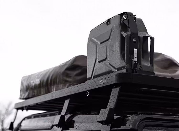 Denna bränsledunkhållare erbjuder en smart lösning utan skrammel och slitage.  Den justerbara säkerhetsspärren i rostfritt stål håller din bränsledunk säkert på plats även under tuff terrängkörning och är byggd för att hålla en livstid.
