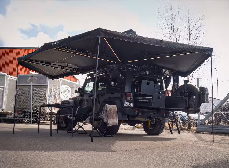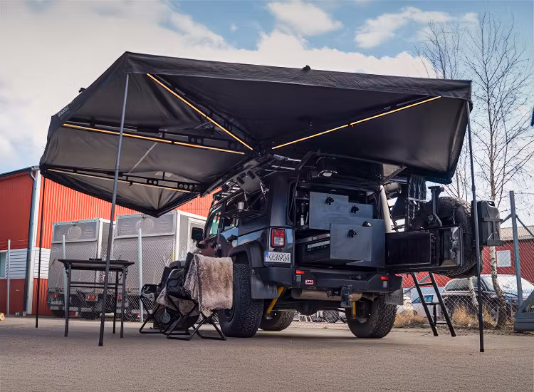 Upplev friheten att skapa en rymlig och skyddad uteplats på några sekunder med Gasell 270° Markis – det perfekta tillbehöret för dina äventyr, oavsett om du campar, overlandar eller bara vill njuta av naturen. Dessutom har markisen inbyggd ledbelysning som lyser upp ditt camp på natten.