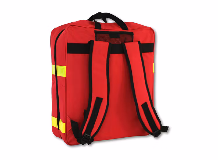 Ryggsäcken är sydd i ett slitstarkt nylonmaterial och har kraftiga vadderade bärremmar, för att den ska vara bekväm att bära på ryggen till den som är skadad. Du kan öppna väskan helt och vika ut den för maximal överblick över innehållet. Förbandsmaterialet ligger i små nätfack, vilket gör det lätt att se all utrustning och hålla ordning i väskan.