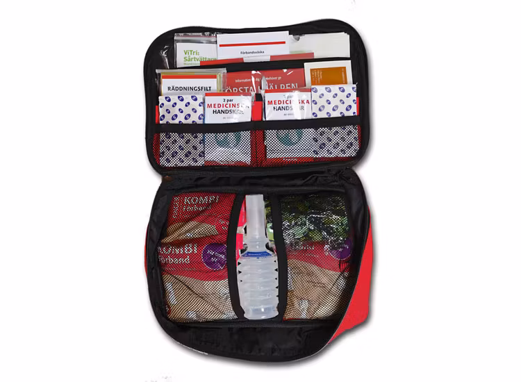 Jaktväskan har också en pincett samt en kraftig klädsax. Saxen gör det enkelt att anpassa förbandsmaterialet eller att snabbt klippa upp kläder i en nödsituation. Du får även med förbandsmaterial som kombiförband, fingerförband, klisterlinda, sterila kompresser, plåster och sår tejp. Räddningsfilten använder du för att skydda hunden eller personen från nedkylning, antingen genom att använda den som skydd mot marken eller lägga den över som en filt. Med de här produkterna kan du hand om allt ifrån små skärsår på fingrarna till ordentliga jack eller blödande sår. Kombiförbandet fäster i sig själv utan att fastna i sår eller päls och är optimalt för sårvård ute i naturen. Tänk på att alltid söka upp sjukvård vid blödande sår från djur!
