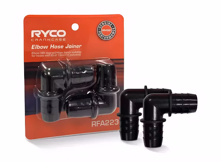 RFA223 är ett set med två lätta 90-graders slangkopplingar från Ryco, anpassade för universell användning. De passar slangar med 19 mm innerdiameter och gör det enkelt att dra PCV- och catch can-slangar snyggt även där utrymmet är begränsat.